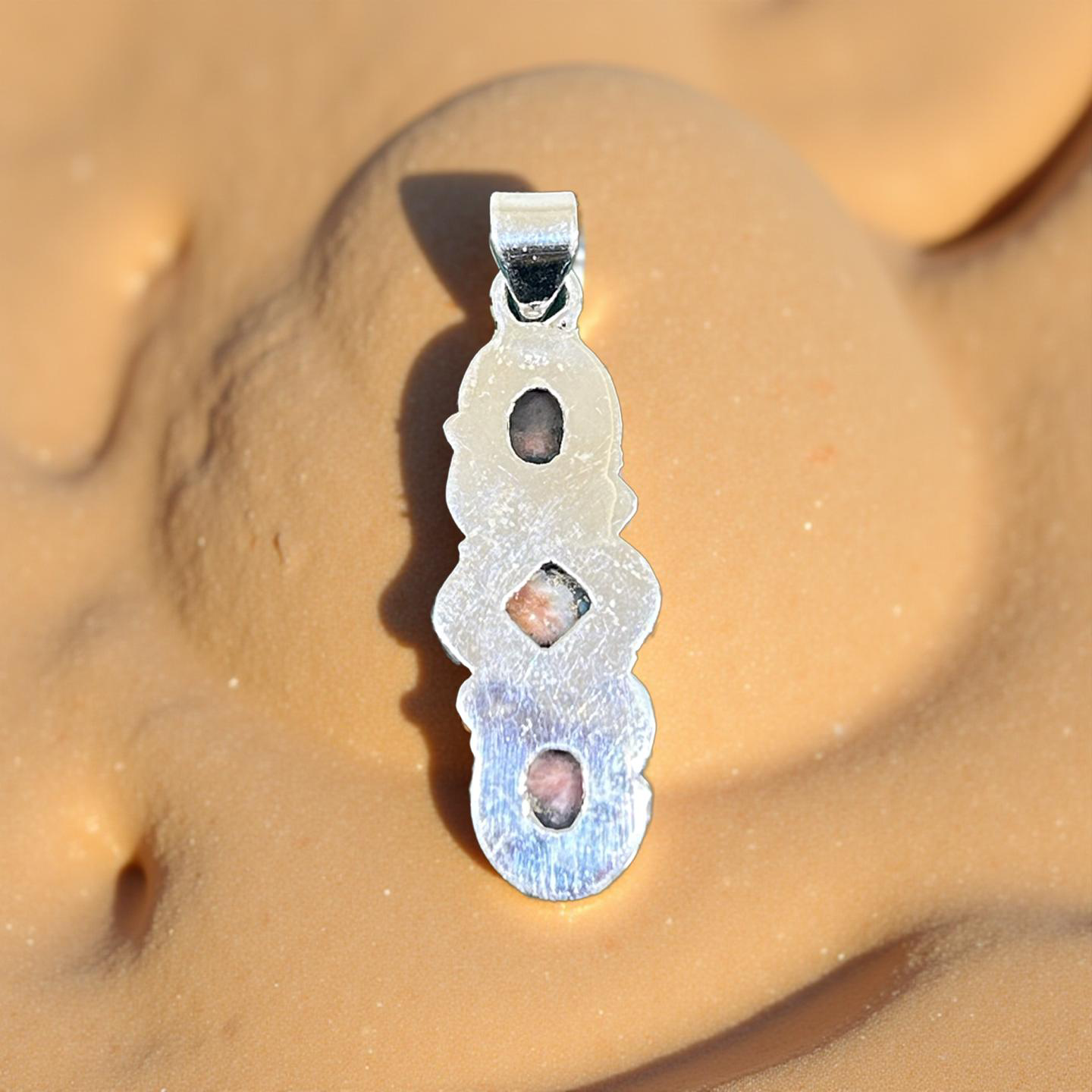 This pendant features an elongated vertical design with three oval and diamond-shaped cabochon stones, arranged in a linear formation. The stones are multicolored, showcasing a striking blend of earthy oranges, oceanic turquoise blues, creamy whites, and subtle gray veining— spiny oyster turquoise dahlia. Each stone is set in a beautifully ornate sterling silver bezel with a rope-like texture and fine leaf and star motifs on the sides. The settings are connected with intricate detailing that enhances the vintage, handcrafted aesthetic of the piece. The top includes a smooth, sturdy bail suitable for most chains. The overall look is elegant, bohemian, and inspired by nature—perfect for someone who loves unique, earthy jewelry with artistic flair.
